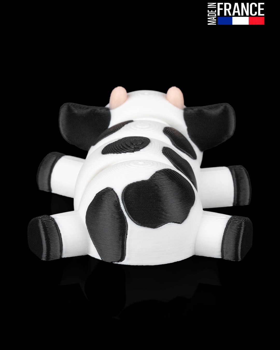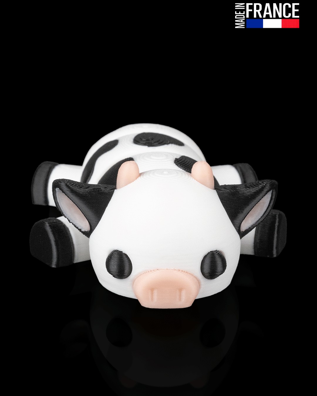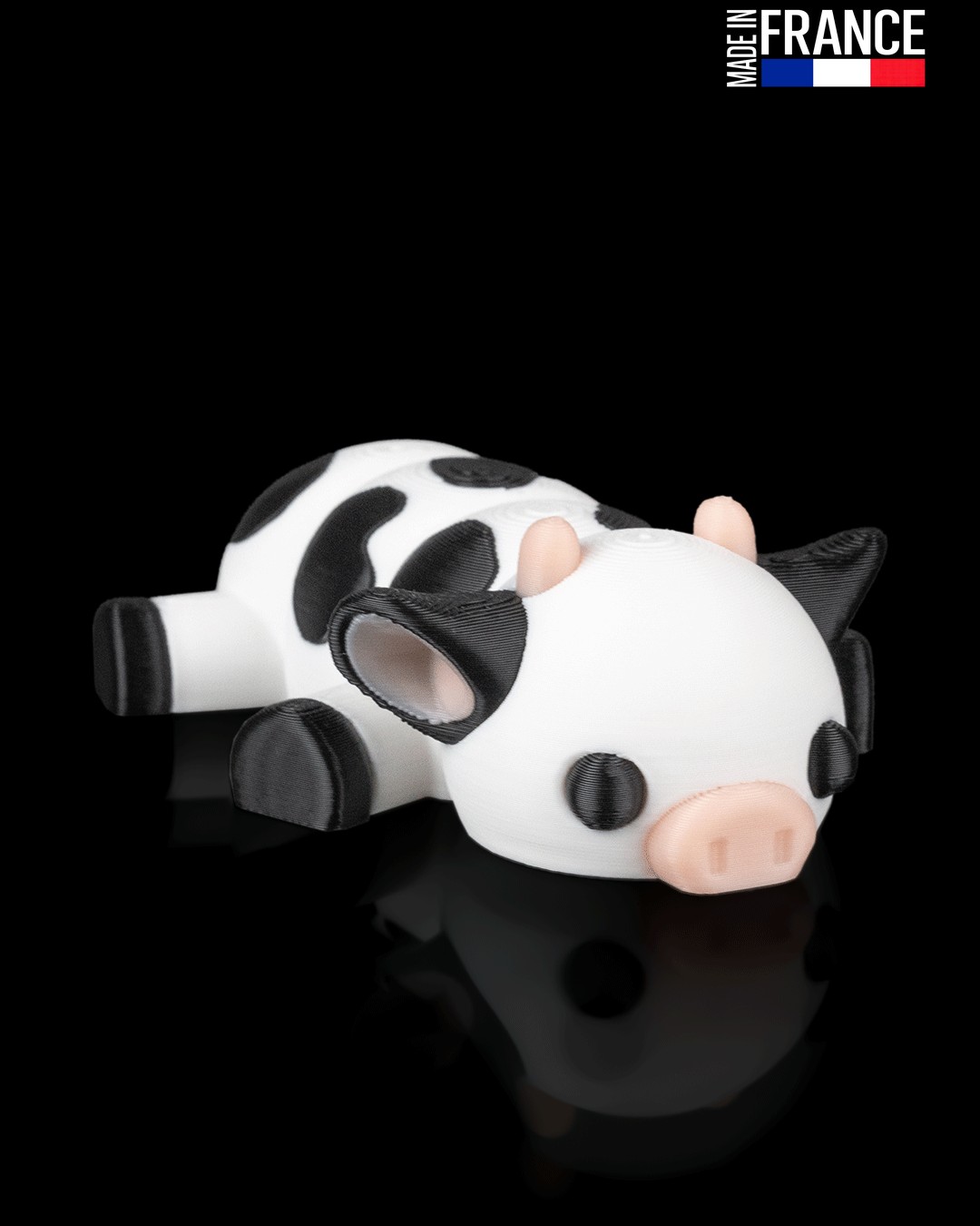 Issue d’un processus d’impression 3D multi-matériaux de haute précision, cette petite vache est une prouesse technique réalisée sans aucune peinture. Chaque détail, du museau couleur chair aux taches noires sur fond blanc, est directement intégré dans la matière. Cette fabrication artisanale française garantit un objet robuste, aux finitions soignées, qui conserve l’éclat de ses couleurs au fil du temps et des manipulations.