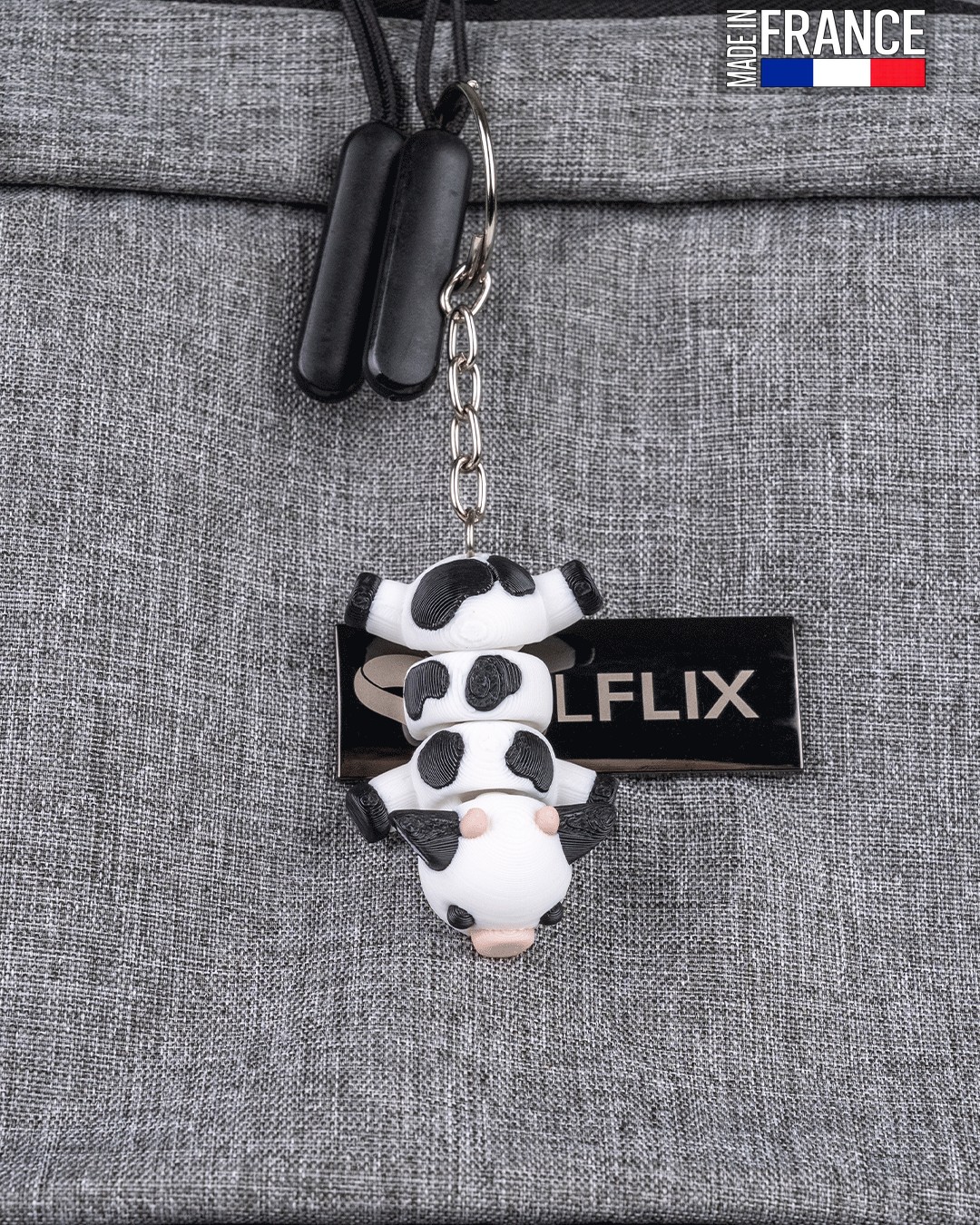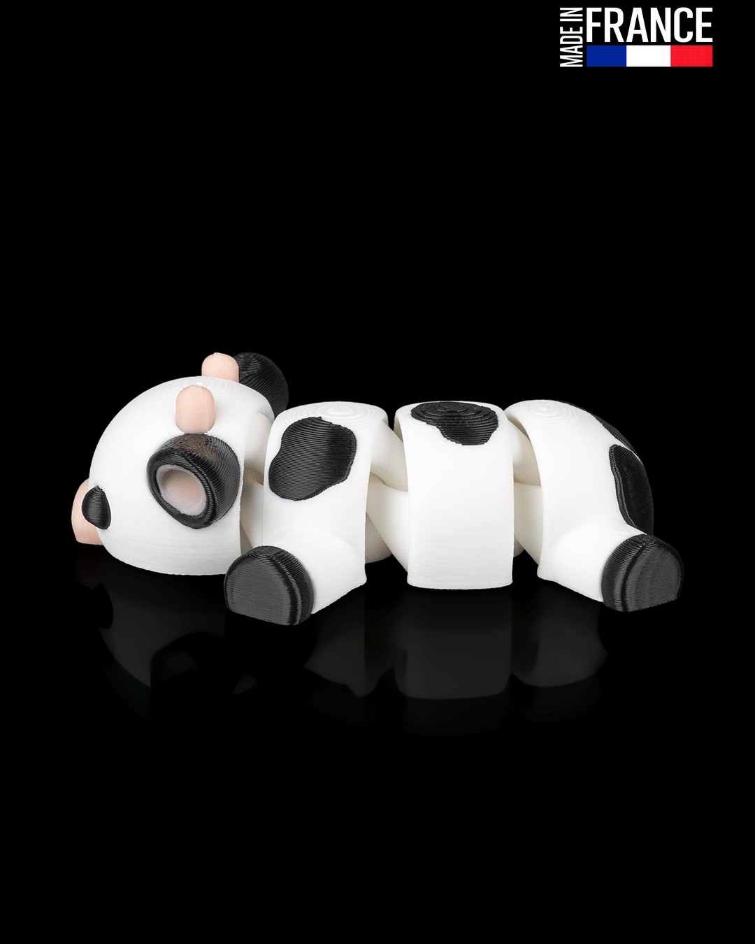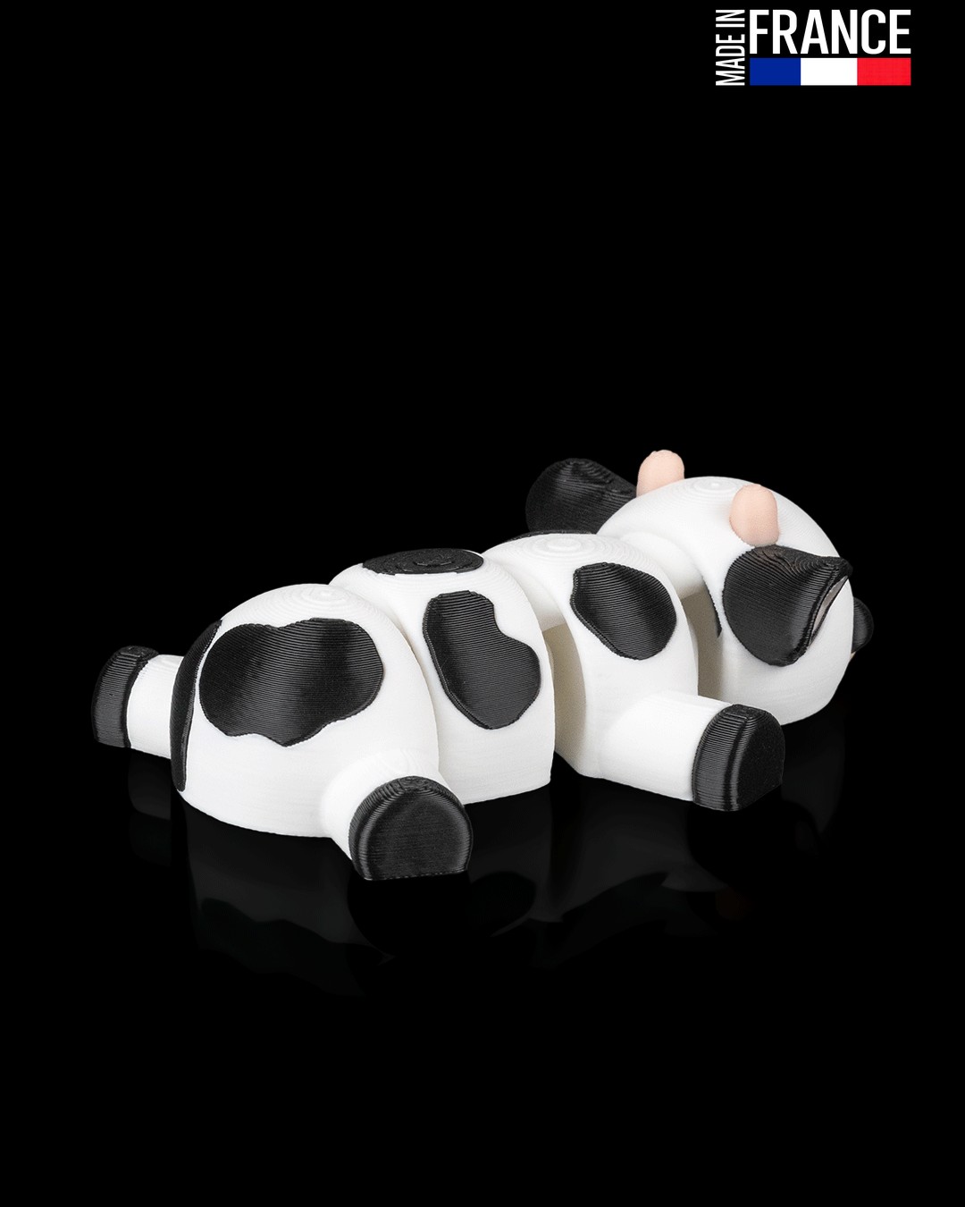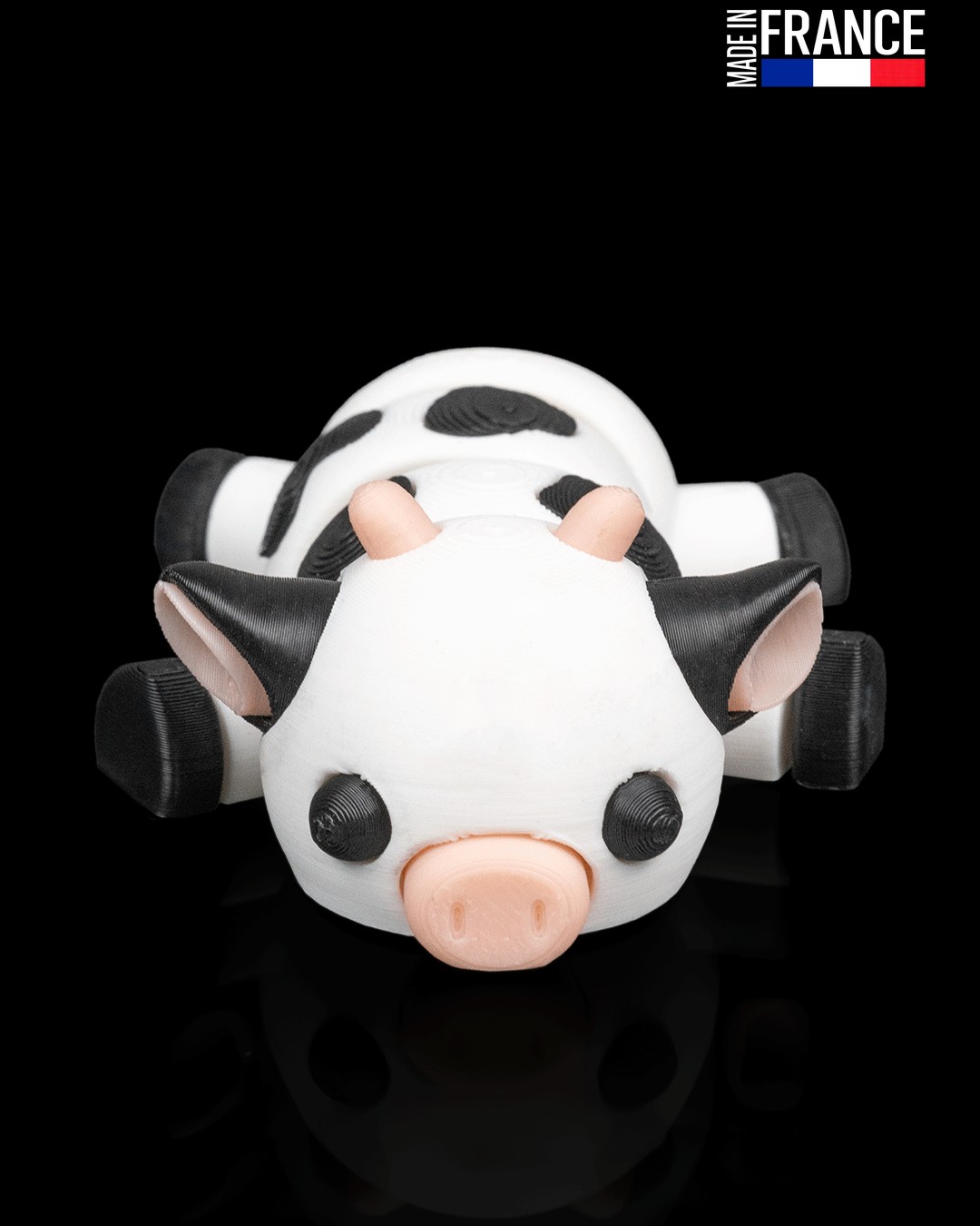 Issue d’un processus d’impression 3D multi-matériaux de haute précision, cette petite vache est une prouesse technique réalisée sans aucune peinture. Chaque détail, du museau couleur chair aux taches noires sur fond blanc, est directement intégré dans la matière. Cette fabrication artisanale française garantit un objet robuste, aux finitions soignées, qui conserve l’éclat de ses couleurs au fil du temps et des manipulations.