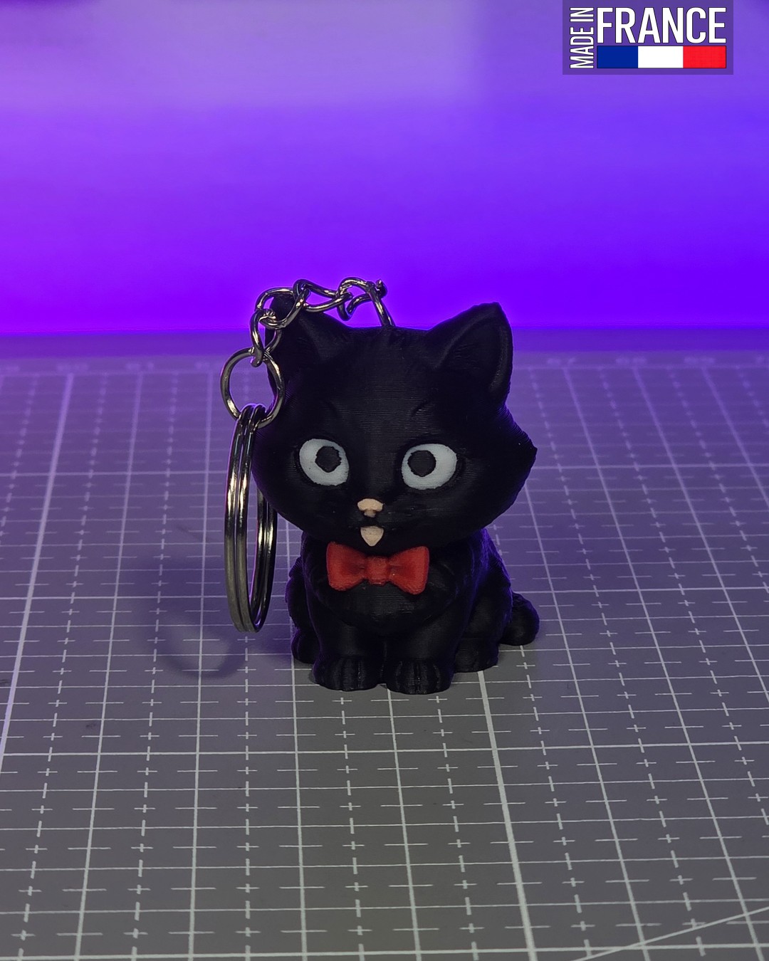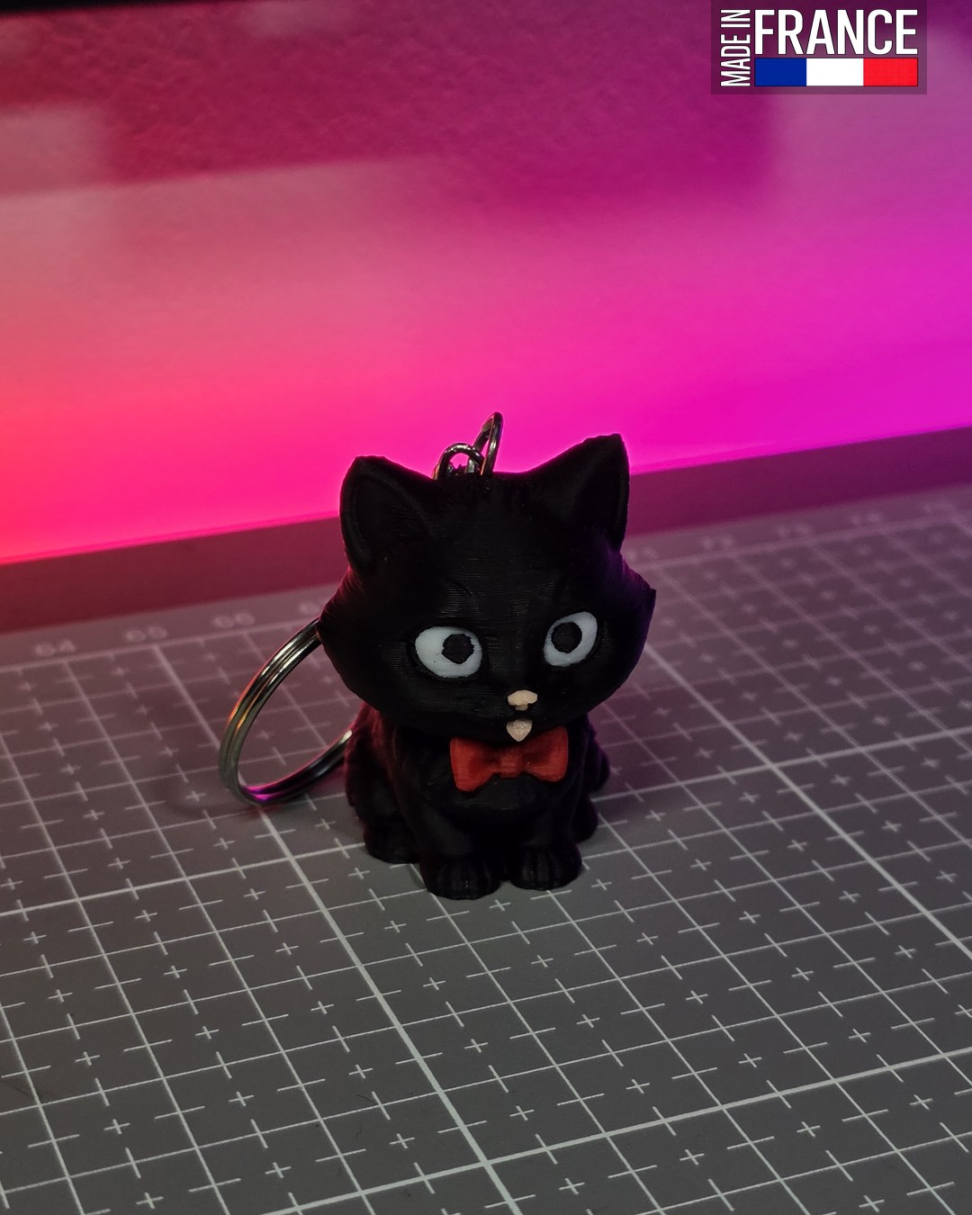 Entièrement conçu et fabriqué dans notre atelier en France, ce porte-clés bénéficie d’une impression 3D multicouleurs de haute volée. Les quatre teintes — le noir profond, le blanc des yeux, le rouge du nœud et le rose du museau — sont fusionnées directement dans la matière lors de la fabrication. Ce procédé artisanal garantit une finition professionnelle sans aucune peinture, pour un décor qui ne s’efface jamais.
