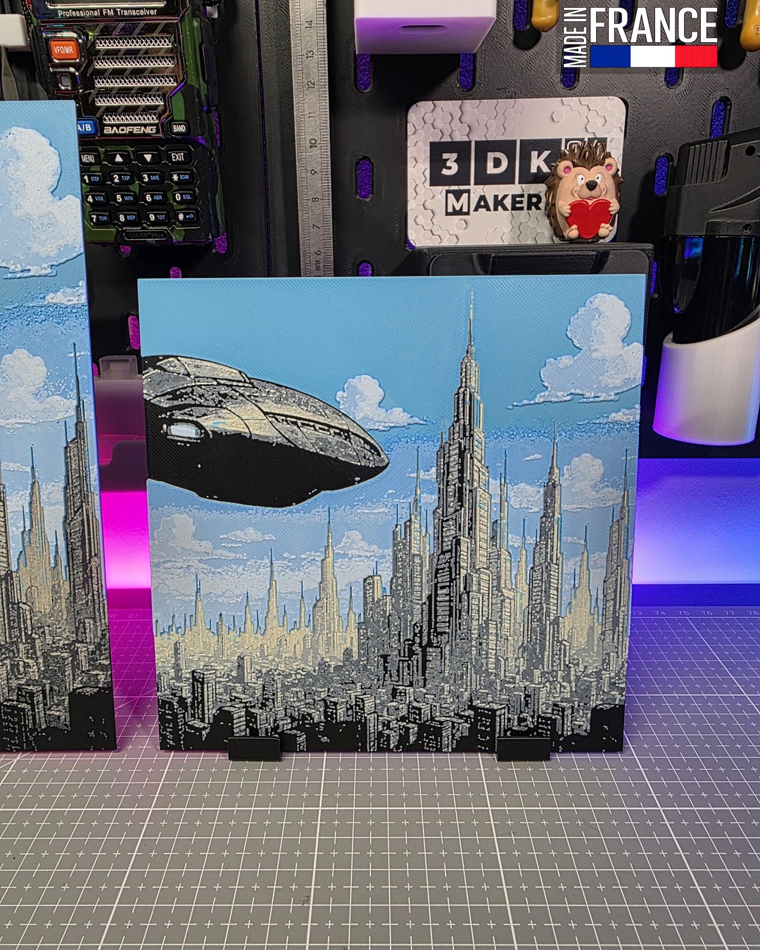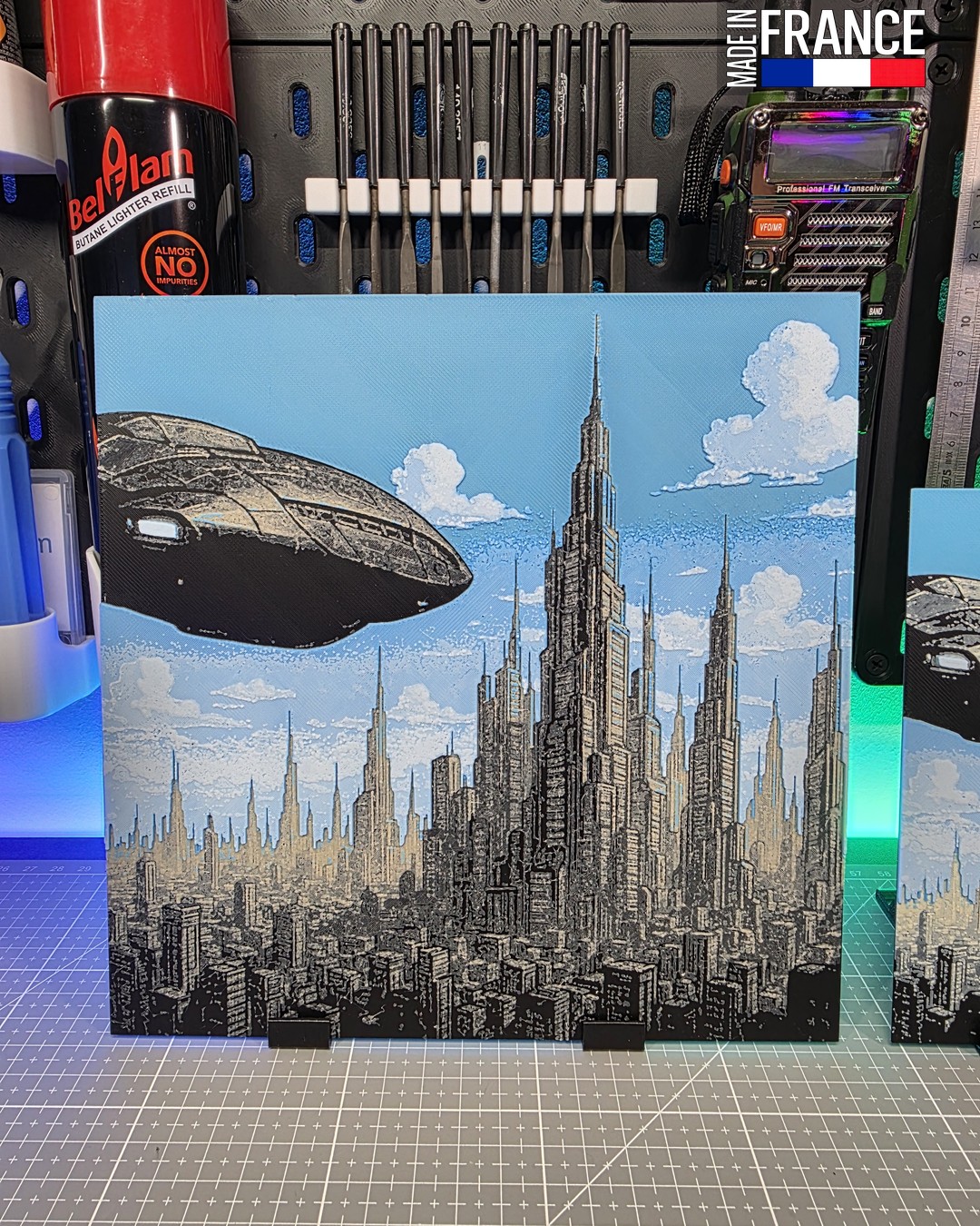 La force de cette création réside dans l’utilisation de la technologie Hueforge, qui permet de sculpter la lumière. La superposition des couches crée un relief saisissant : le Noir définit les ombres des gratte-ciels, le Beige apporte une chaleur structurelle aux façades, tandis que le mélange du Bleu et du Blanc simule l’éclat des néons et la réflexion des vitrages. Ce n’est pas une simple image, mais une ville en relief qui semble s’étendre à l’infini derrière la plaque.
