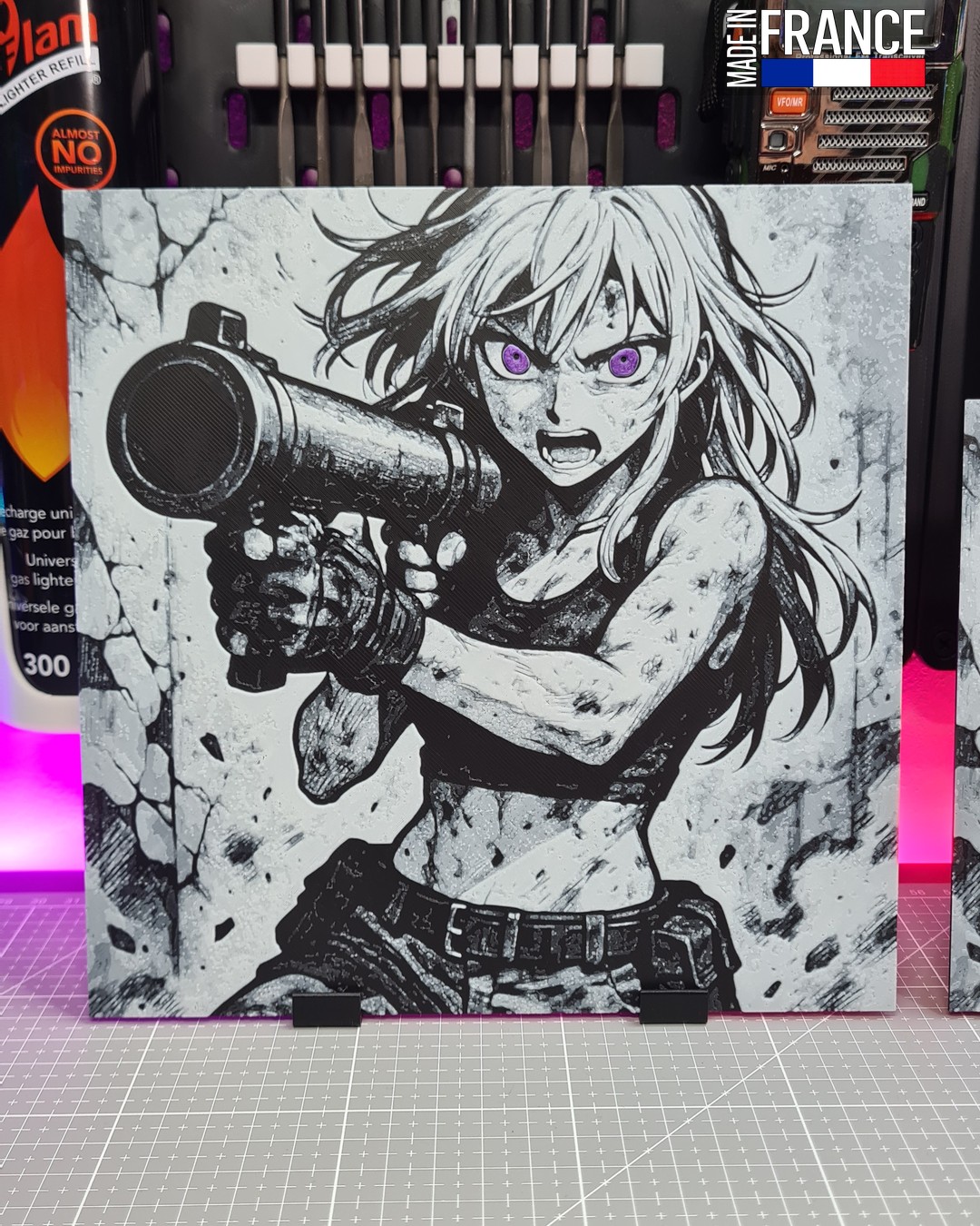 Faites exploser votre décoration avec cette œuvre Hueforge saisissante mettant en scène une héroïne d’anime maniant un lance-roquettes. Entre intensité guerrière et esthétique manga brute, cette pièce capture un instant de pure puissance où le regard violet hypnotique de la protagoniste semble percer l’image. C’est la pièce maîtresse idéale pour tout setup gaming ou collection de fan d’animation japonaise cherchant un objet à fort impact visuel.