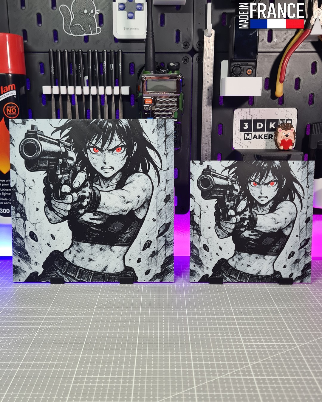 Fabriqué avec passion dans notre atelier français, ce tableau est imprimé en 4 couleurs sans aucune peinture. Le rendu final, incluant le rouge vibrant du regard et la finesse des textures métalliques, provient exclusivement de la fusion de filaments de haute qualité : blanc, noir, gris et rouge. Ce procédé artisanal garantit une œuvre durable, légère et aux finitions impeccables, témoignant du meilleur de la fabrication additive moderne.