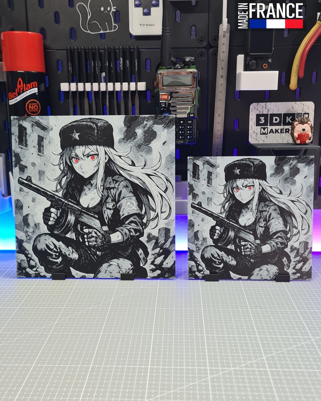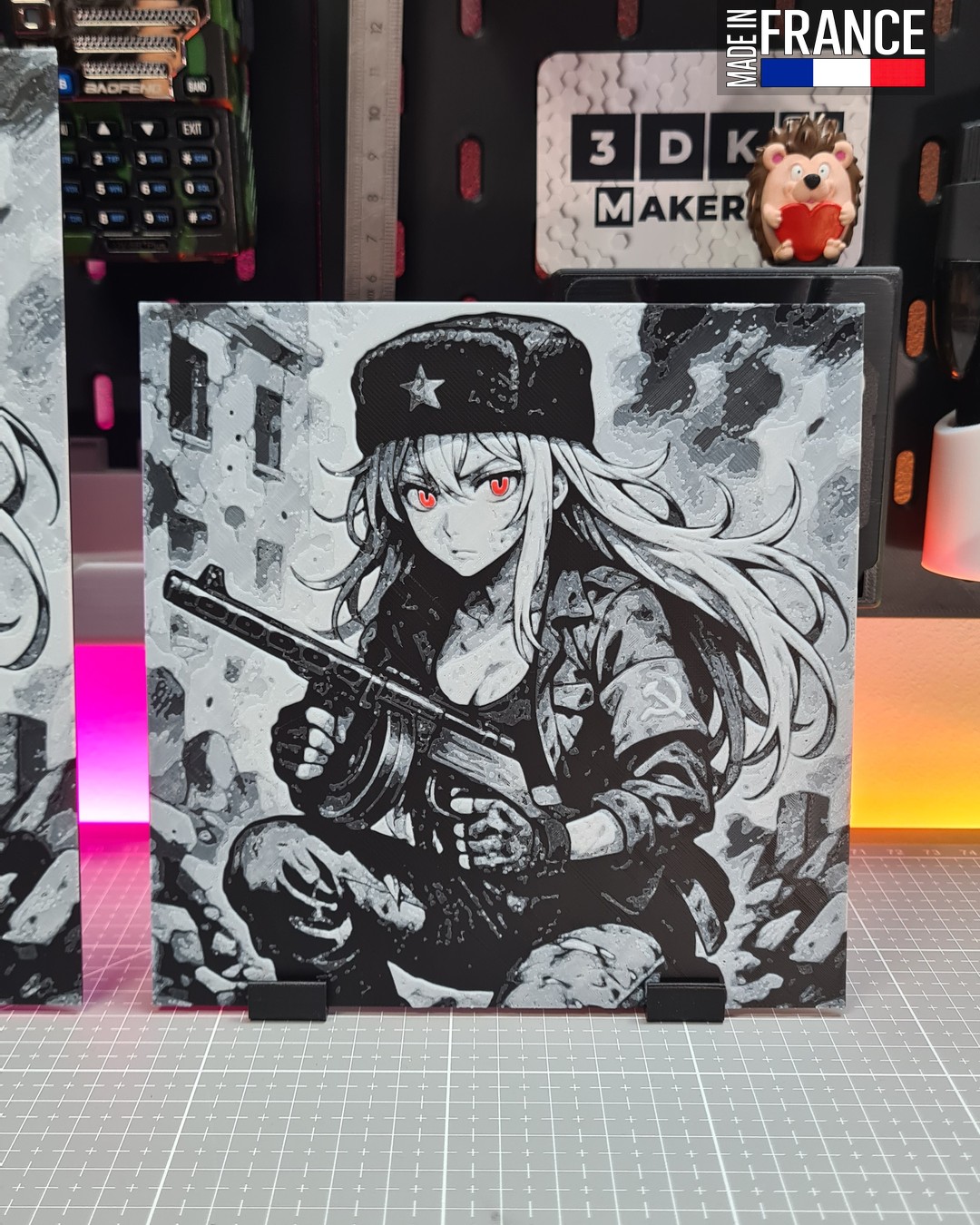 Plongez dans une esthétique historique revisitée avec cette œuvre Hueforge mettant en scène une héroïne d’anime au style « militaria », armée du légendaire PPSh soviétique. Alliant le charme du design manga à la silhouette iconique de l’armement classique, cette pièce capture une intensité dramatique unique. Ses yeux rouges incandescents percent l’image, créant un contraste saisissant qui apportera une aura de mystère et de puissance à votre décoration.