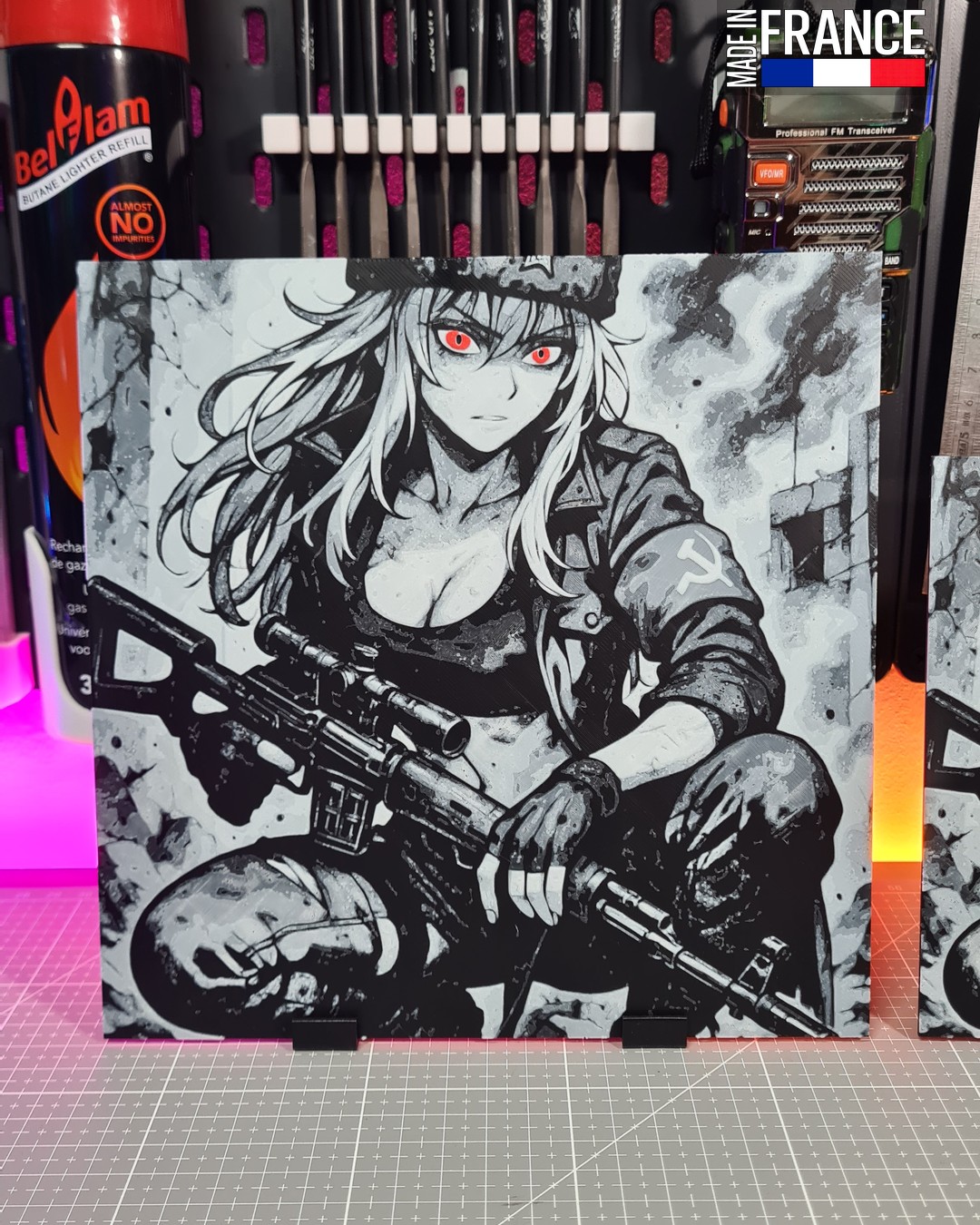 Immergez-vous dans une atmosphère de solitude et de précision avec cette œuvre Hueforge représentant une tireuse d’élite d’anime équipée de son fusil de précision soviétique. Alliant le charme du design manga à l’esthétique rigoureuse du matériel historique, cette pièce capture un instant de concentration absolue. Ses yeux rouges perçants, tels un viseur laser, contrastent magnifiquement avec le traitement monochrome pour créer une pièce de décoration au charisme magnétique.