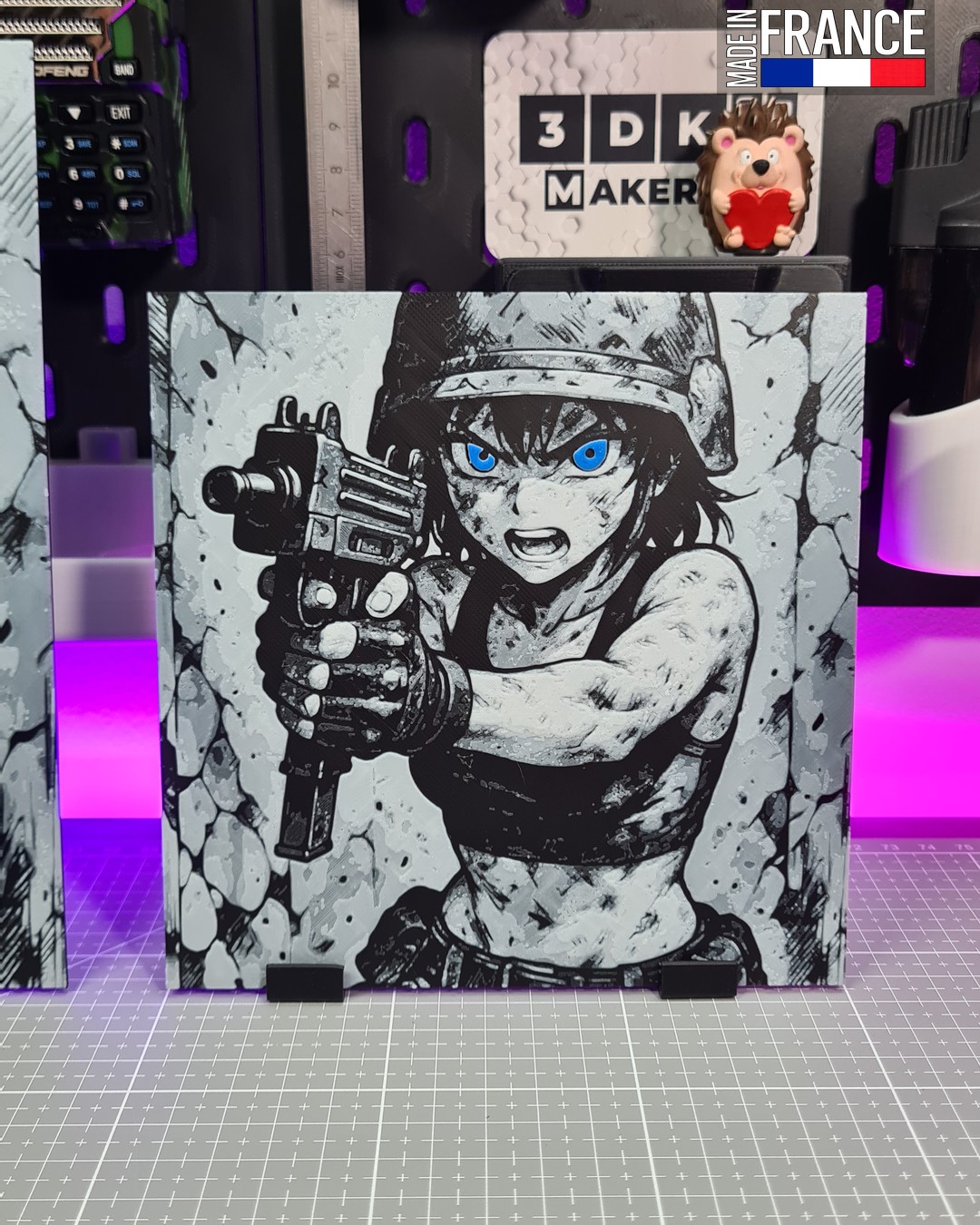 La technologie Hueforge sublime ce portrait en jouant sur une superposition millimétrée des couches pour créer un relief saisissant. Ce n’est pas une simple illustration plate, mais une véritable plaque texturée où chaque détail, de la structure mécanique de l’arme aux mèches de cheveux, gagne en profondeur physique. Les contrastes entre les dégradés de gris et l’éclat des yeux offrent une expérience visuelle immersive qui change selon l’angle de vue.