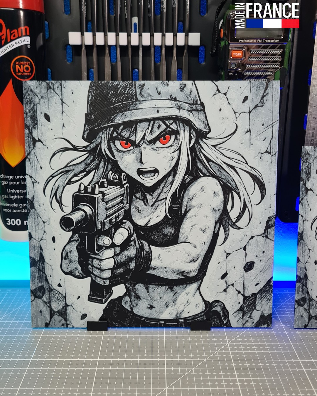 Faites monter la tension de votre collection avec cette œuvre Hueforge percutante mettant en scène une héroïne d’anime maniant un Uzi avec une détermination farouche. Entre esthétique urbaine et intensité manga, cette pièce capture un instant de combat pur où le regard rouge incandescent de la protagoniste semble traverser l’image. C’est l’élément de décoration idéal pour apporter une énergie brute et moderne à votre setup gaming ou votre espace de lecture.