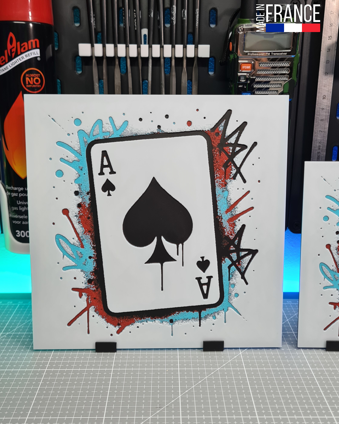 Le symbole le plus iconique du jeu de cartes, revisité en mode graffiti urbain ! L’As de Pique affiche ici toute sa puissance visuelle avec une impression 3D Hueforge pleine de caractère.