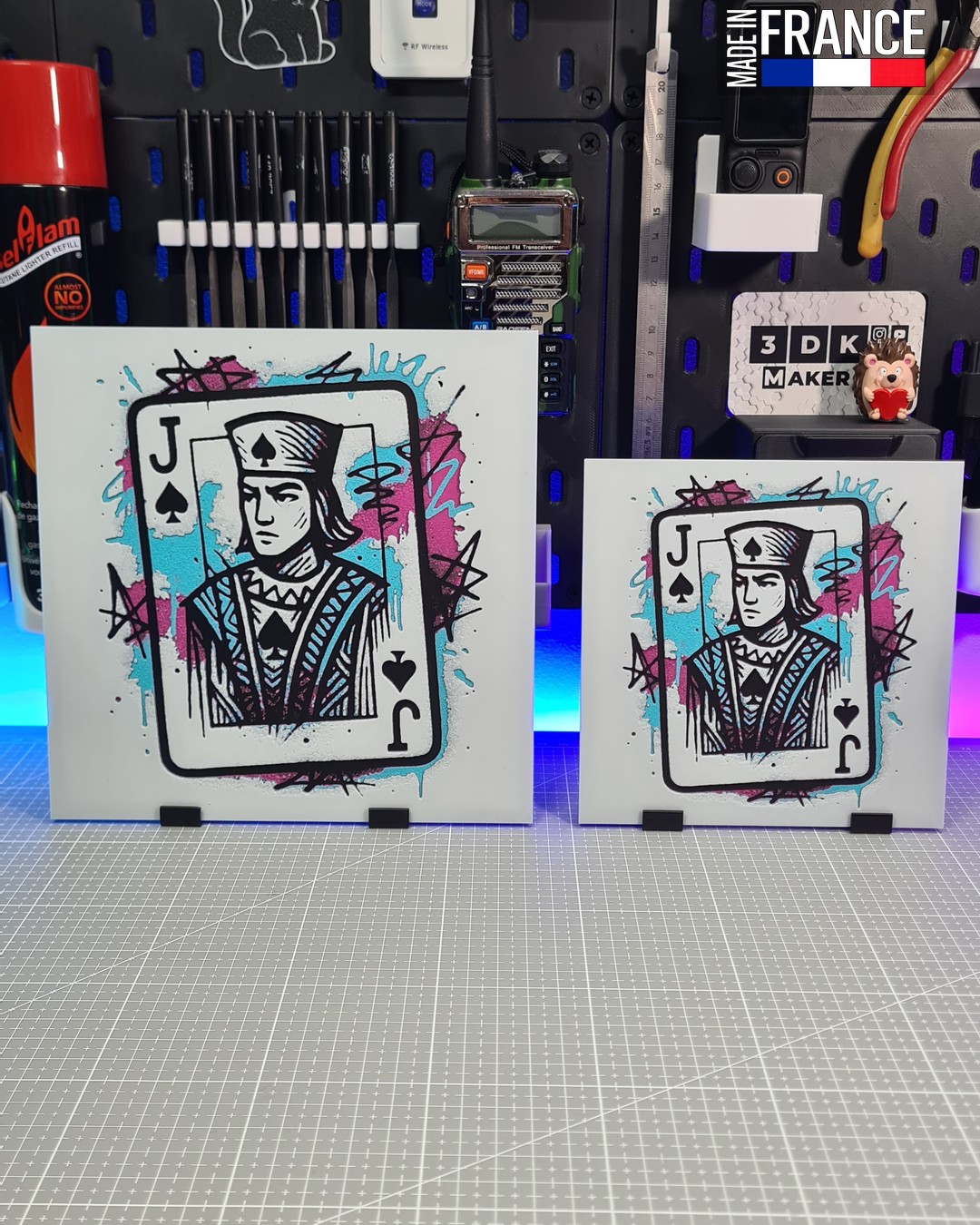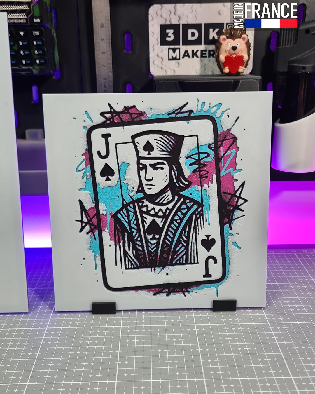 Grâce à la technologie Hueforge, ce tableau décoratif joue avec les profondeurs et les textures. Chaque éclat de peinture « graffiti » en arrière-plan est minutieusement rendu par la superposition de filaments de différentes teintes, créant un relief subtil qui accroche la lumière. Les accents de bleu cyan et de rose magenta contrastent violemment avec le noir du Valet, offrant un rendu visuel dynamique et percutant.