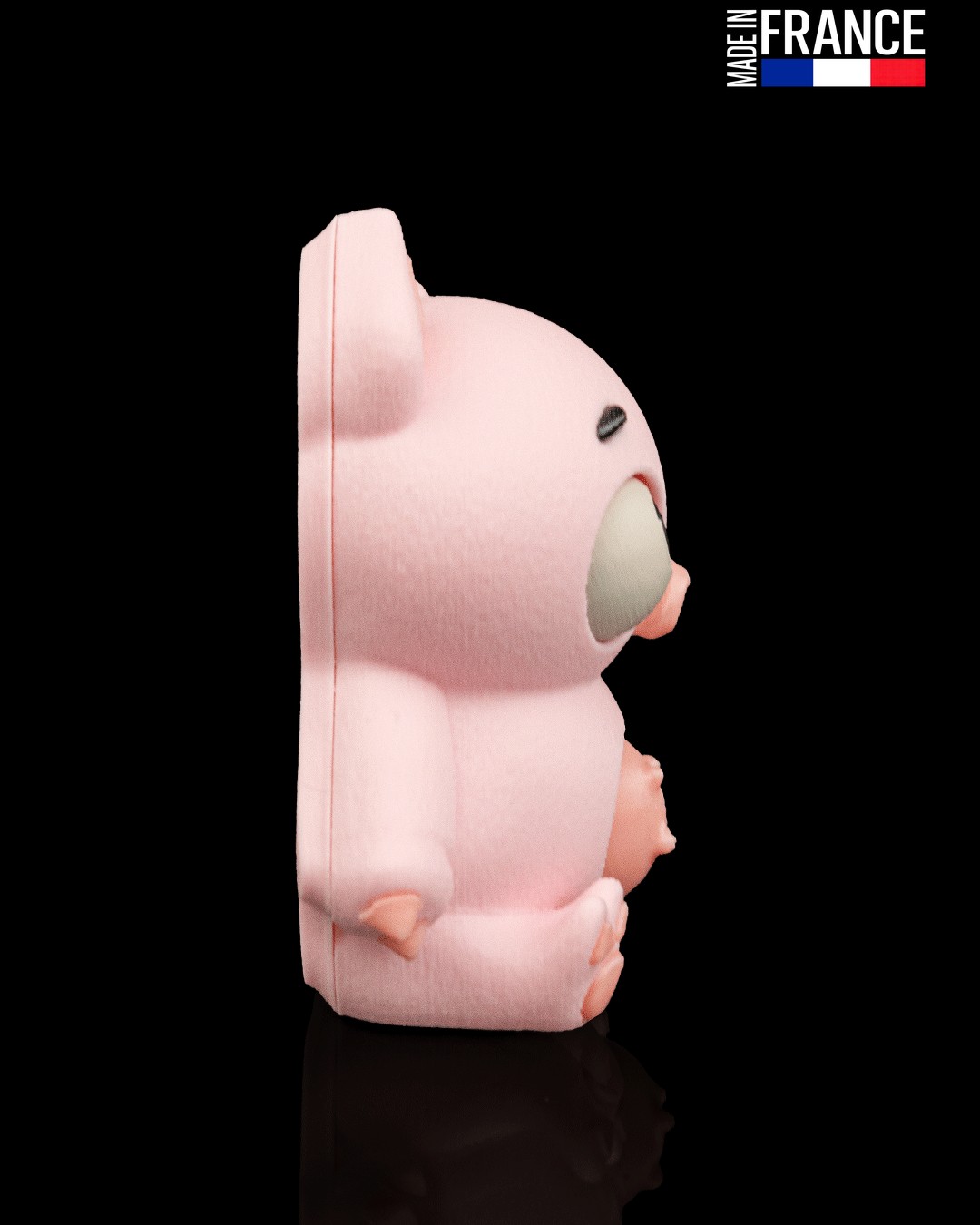 Ce modèle se distingue par un assemblage minutieux de plusieurs pièces de couleurs différentes, offrant un contraste visuel saisissant entre son corps rose tendre, ses grands yeux expressifs et son petit groin texturé. Ce design spécifique permet d’obtenir des détails d’une netteté exceptionnelle et des reliefs marqués qui donnent vie au personnage.