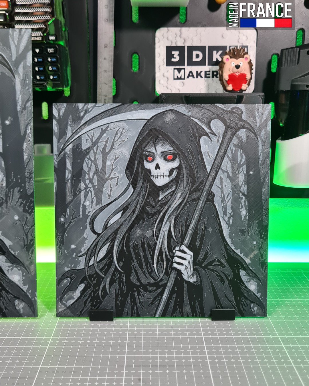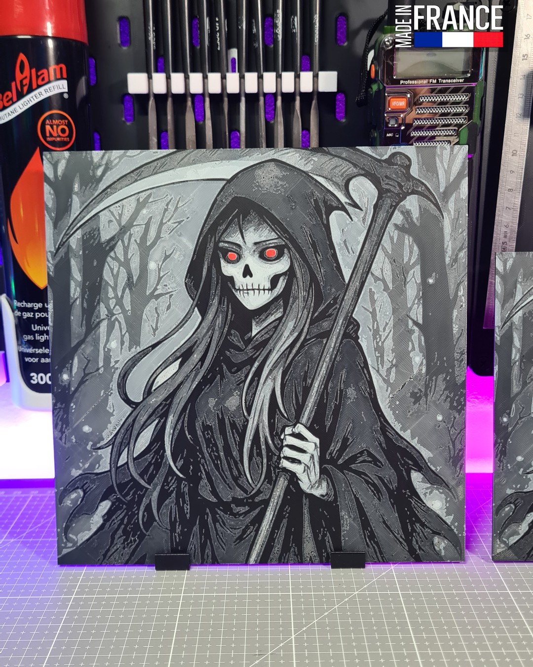 La magie de la technologie Hueforge opère ici dans la gestion des textures sombres et voilées. Ce n’est pas une simple image, mais une plaque en relief où chaque pli de la bure, chaque reflet sur la lame de la faux et chaque mèche de cheveux est physiquement sculpté par la superposition des couches de filament. Le jeu des contrastes entre le noir profond et les gris éthérés donne une dimension tactile et une profondeur spectrale à cette figure emblématique.