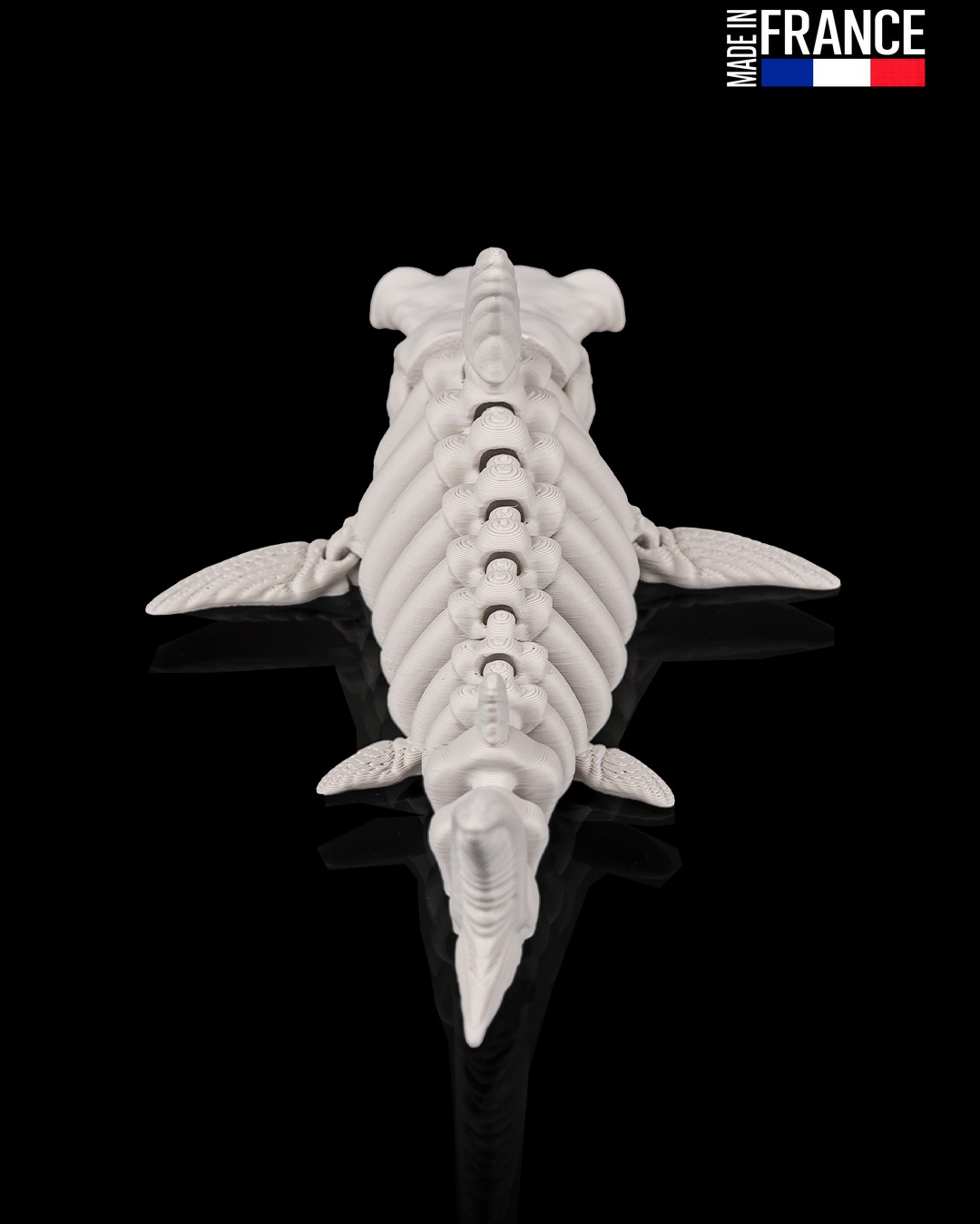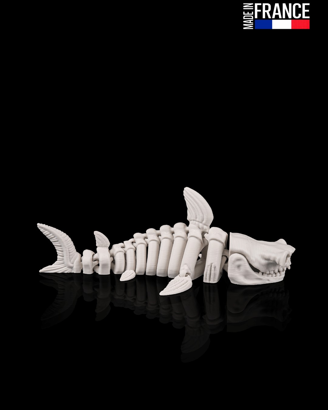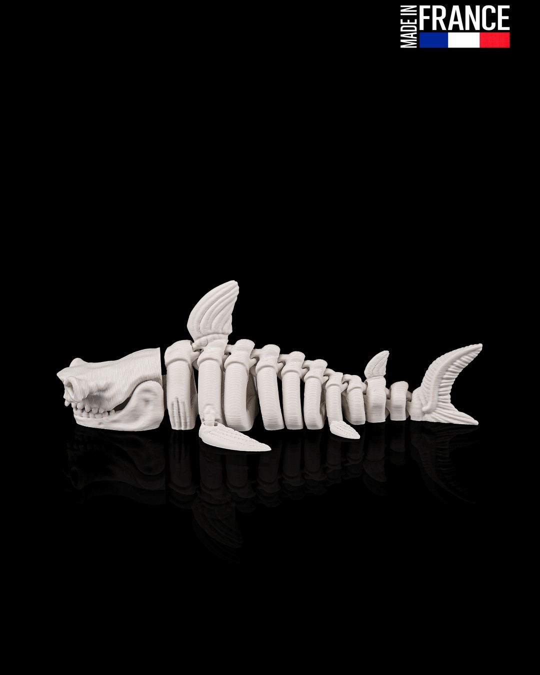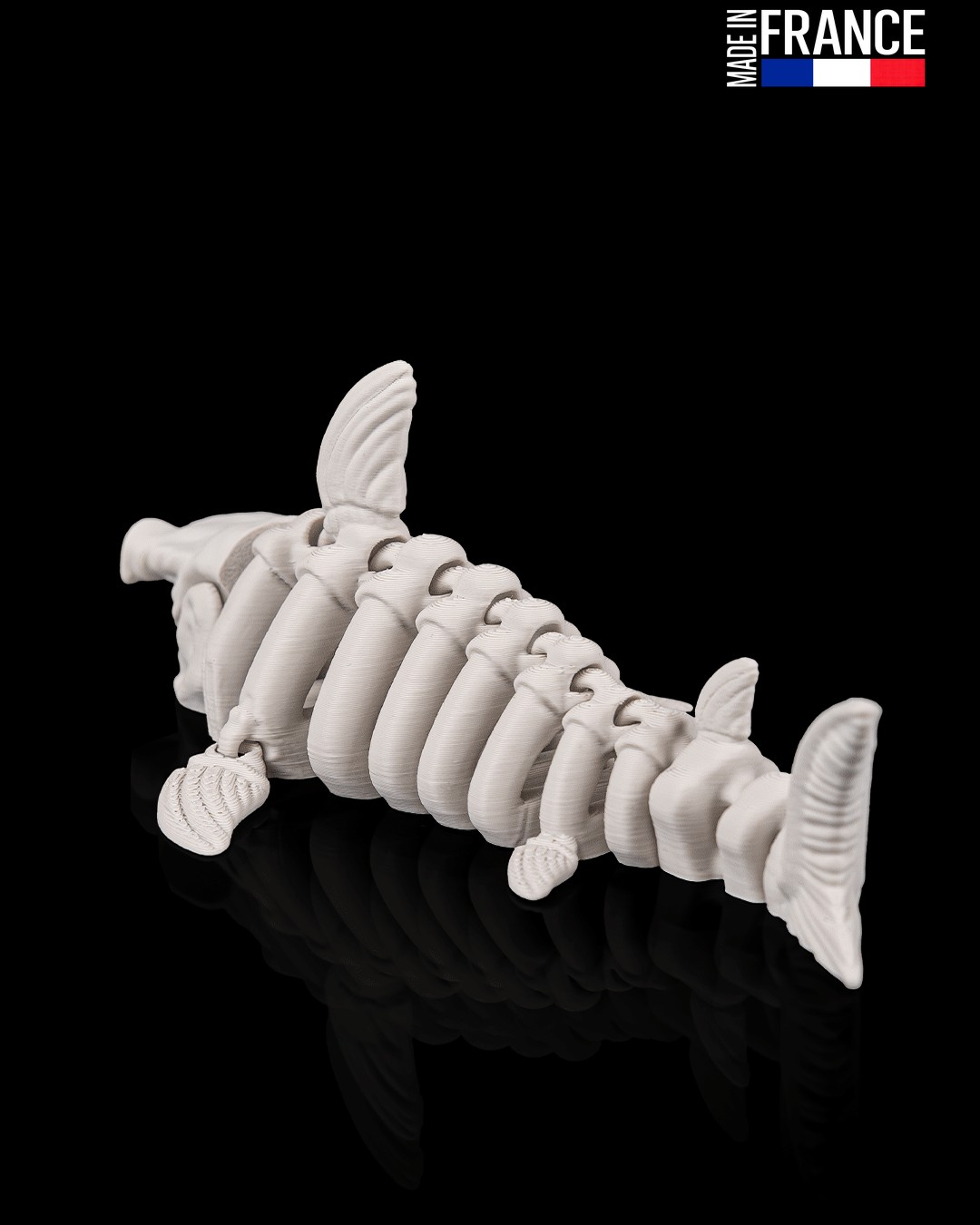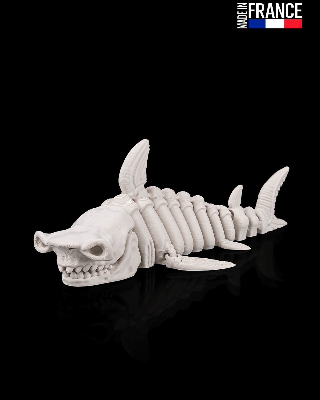 Ce prédateur des abysses ne se contente pas d’être impressionnant : il est intégralement articulé. Grâce à une ingénierie de précision, chaque vertèbre de sa colonne squelettique est mobile, permettant au requin d’adopter des poses dynamiques et de simuler une nage sinueuse d’un réalisme frappant. Imprimé d’un seul bloc sans aucun montage, ce système de charnières internes garantit une flexibilité fluide et une robustesse à toute épreuve, parfait pour être manipulé comme objet anti-stress ou exposé fièrement.